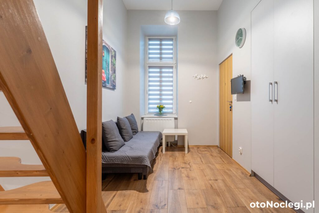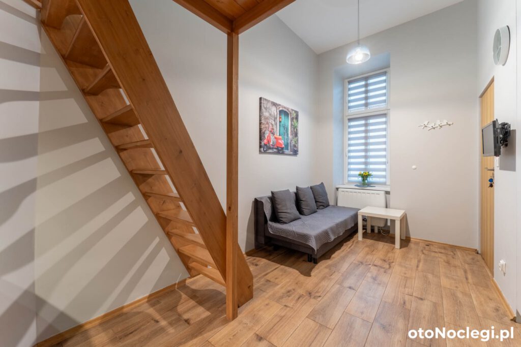 Stylowe studio, które maksymalnie wykorzystuje przestrzeń kamienicy. Antresola z wygodnym materacem tworzy przytulną strefę nocną, a nowoczesny aneks kuchenny i strefa wypoczynkowa zapewniają wszystko, co niezbędne do udanego city breaku.